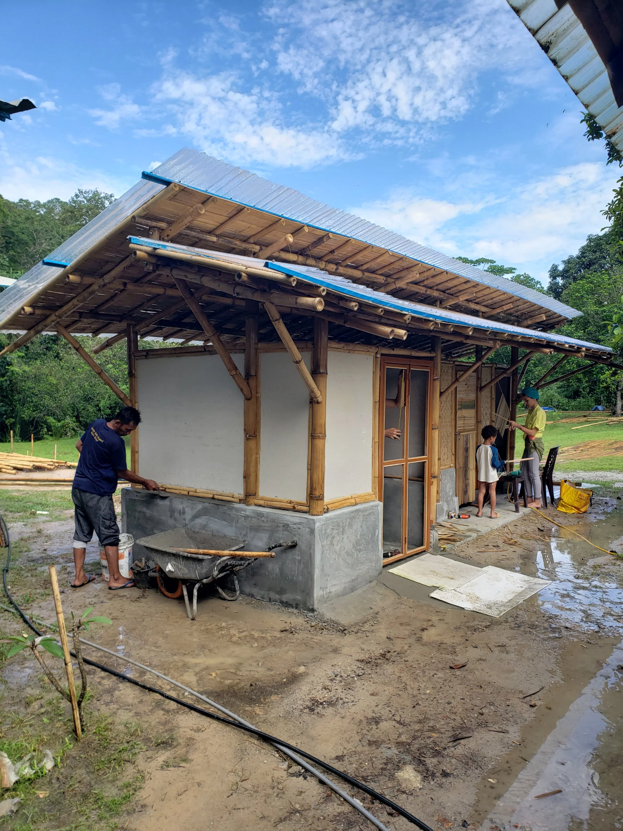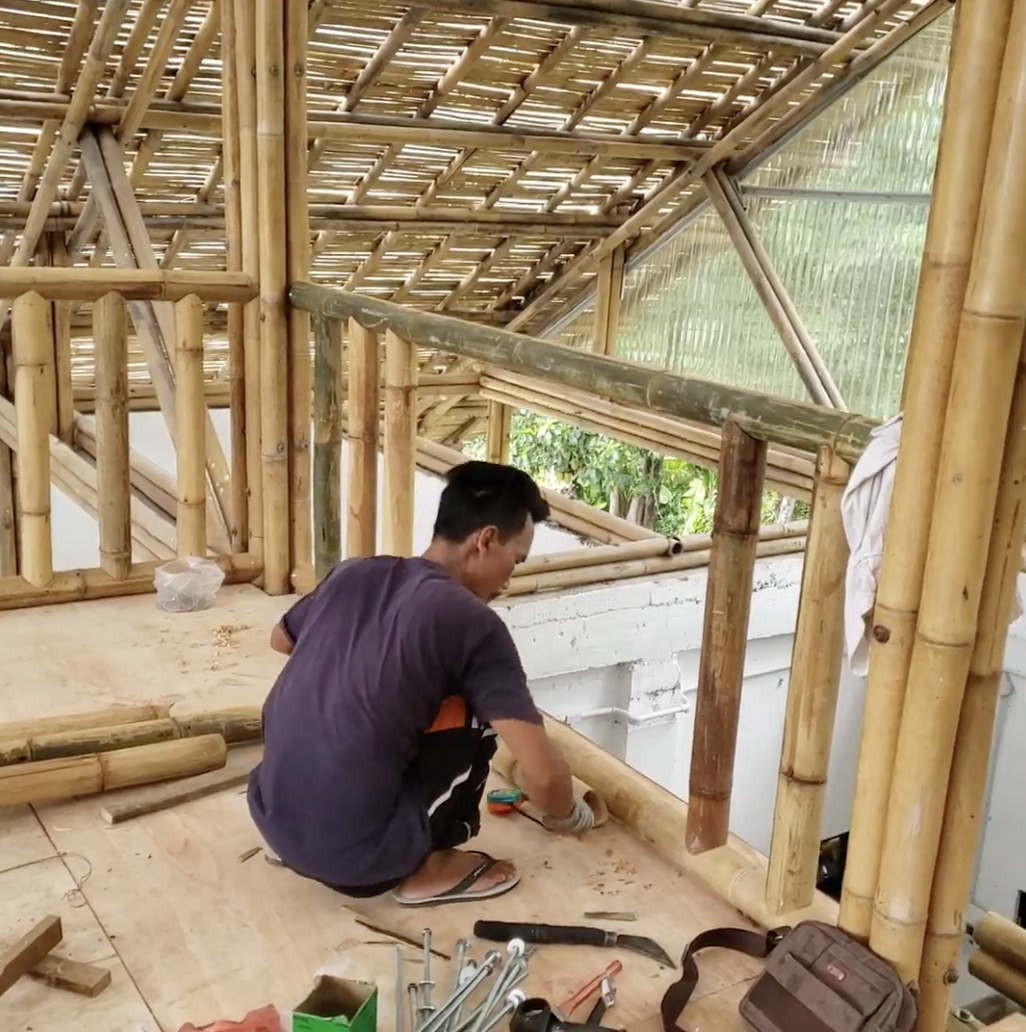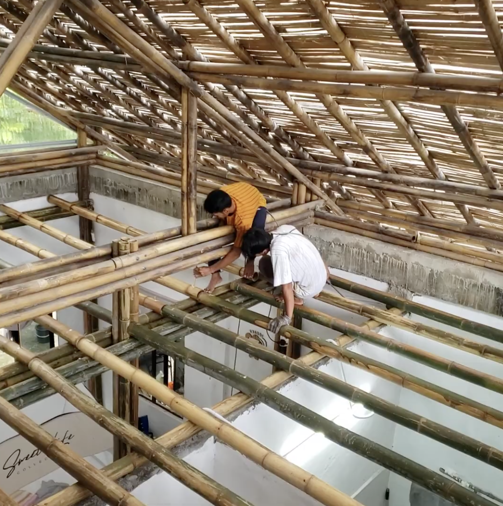Recycled bamboo is used throughout the project, repurposed as structural, spatial, and expressive components.